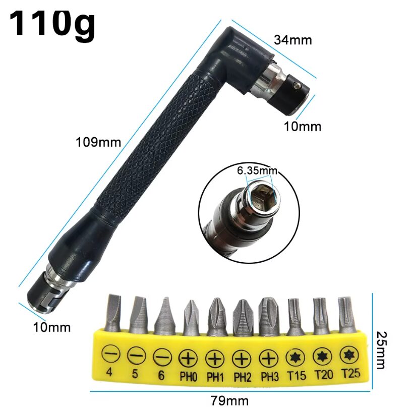 This screwdriver bit set is a practical upgrade for any toolbox. Designed for both DIY users and professionals alike, the kit includes 10 popular 1/4-inch hex bits along with a handy 90-degree L-shaped adaptor. It’s the perfect solution for fastening and tightening tasks in tight or awkward spaces.
