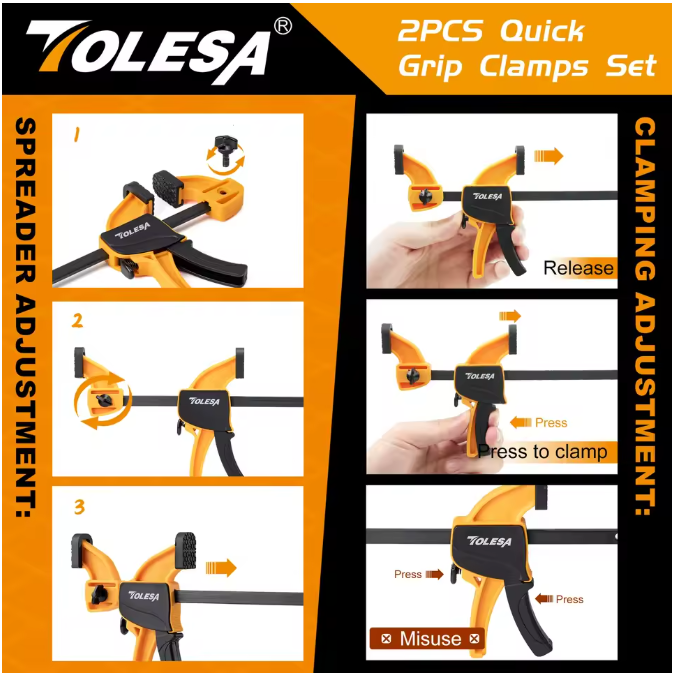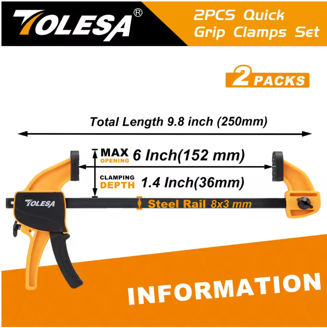 Upgrade your workspace with this set of 2 TOLESA 6-inch woodworking clamps, designed for fast, reliable, and secure clamping. These quick-change bar clamps are perfect for woodworking, cabinetry, furniture assembly, and general repair work. Their 6-inch reach provides extended grip range while maintaining a strong hold — ideal for DIYers and professionals alike.